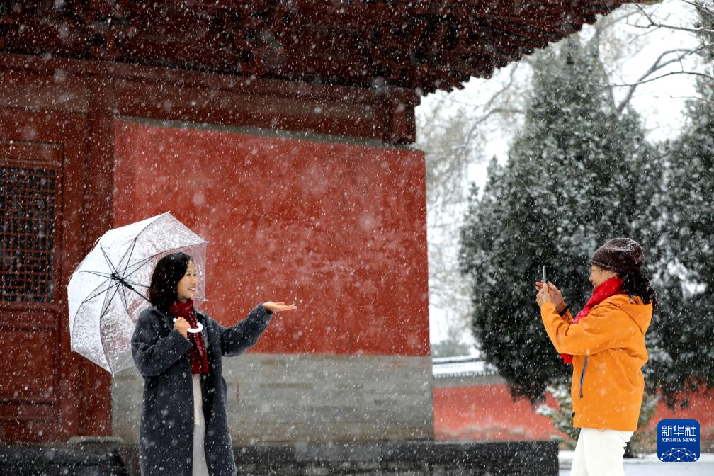 12月12日,市民在河南省济源市济渎庙赏雪拍照。