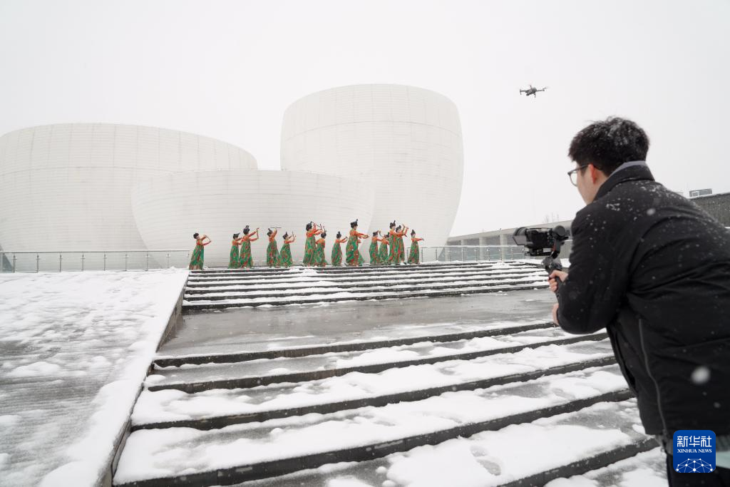 12月12日,摄影师和模特在河北省邢台市内丘县邢窑博物馆广场冒雪拍摄视频。