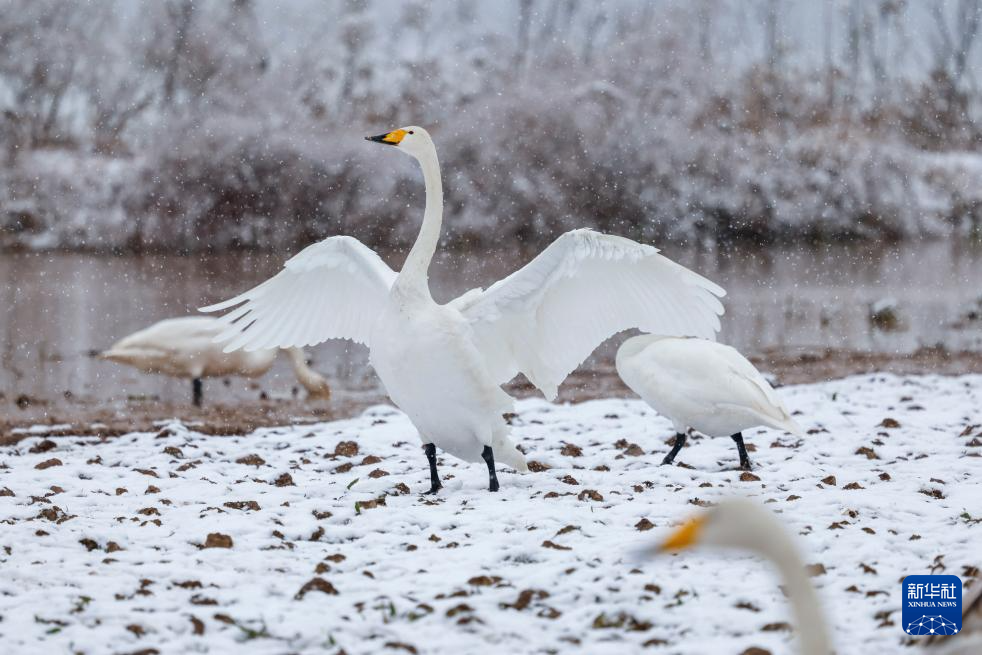 12月12日,在山西省运城市平陆县黄河湿地,大天鹅在雪中漫步。