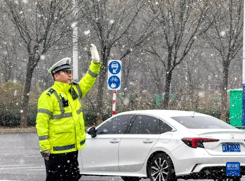 12月12日,在河北省衡水市,交警在雪中指挥交通。