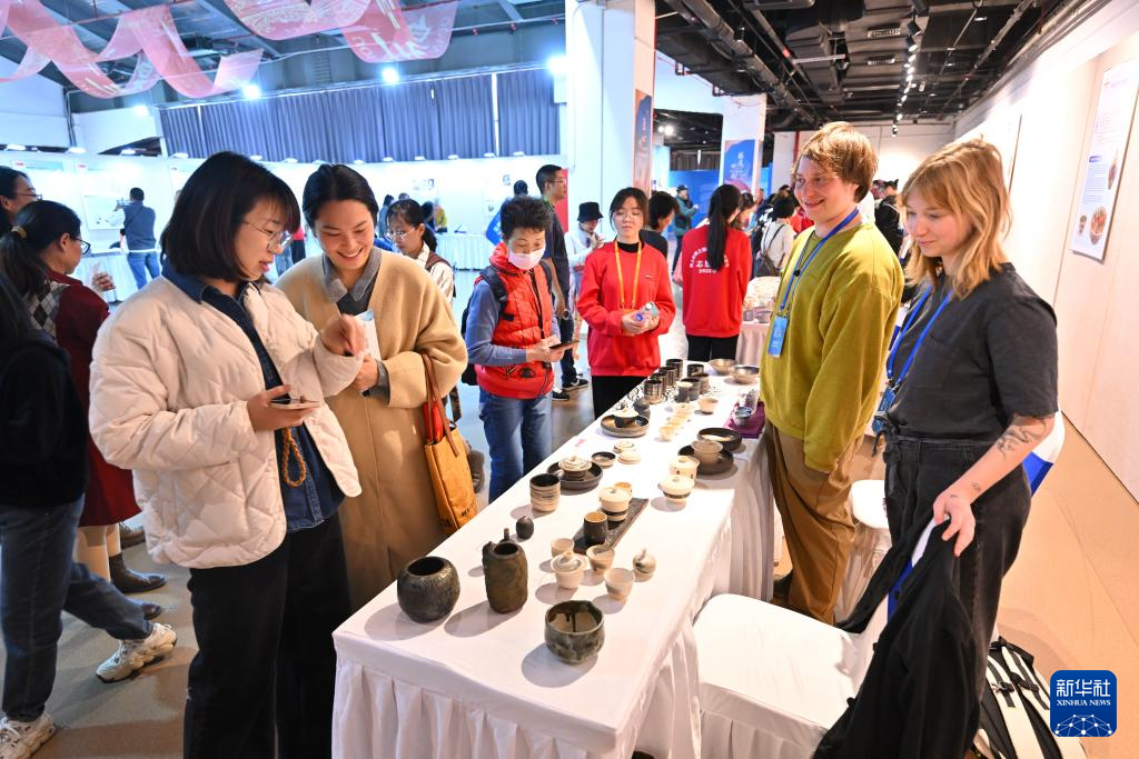 12月12日,游客在海上丝绸之路非物质文化遗产展演活动上参观选购波兰陶瓷茶具。