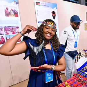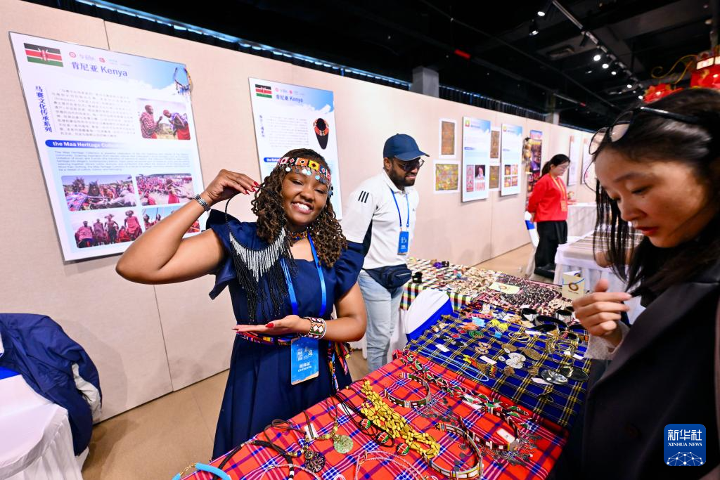 12月12日,肯尼亚参展代表在海上丝绸之路非物质文化遗产展演活动上展示传统饰品。