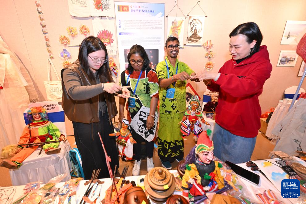 12月12日,游客在海上丝绸之路非物质文化遗产展演活动上体验斯里兰卡提线木偶。