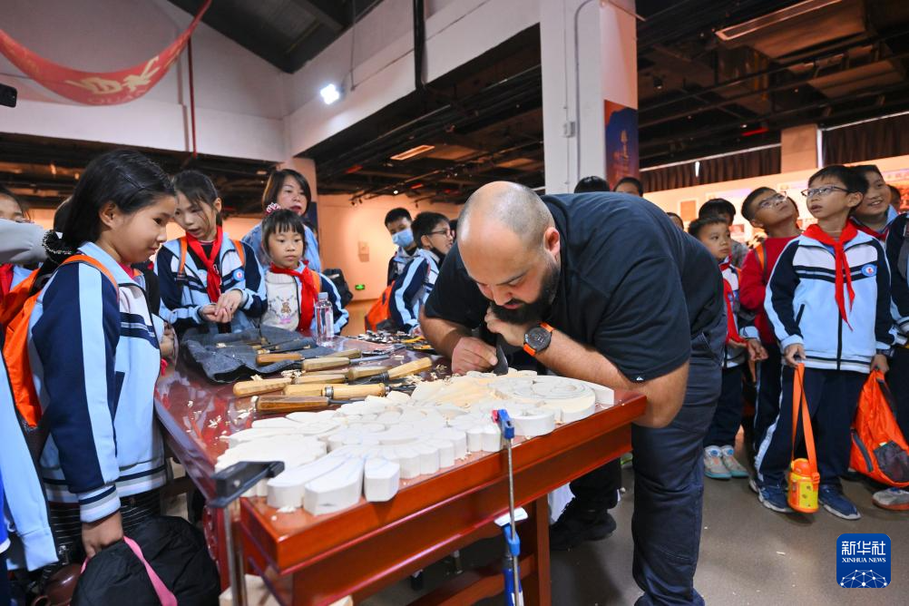 12月12日,泉州市小学生在海上丝绸之路非物质文化遗产展演活动上观看保加利亚传统木雕技艺。