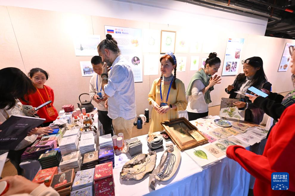 12月12日,游客在海上丝绸之路非物质文化遗产展演活动上选购俄罗斯植物插画和花茶制品。