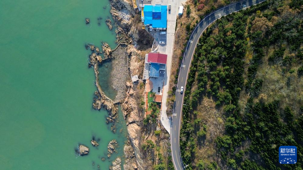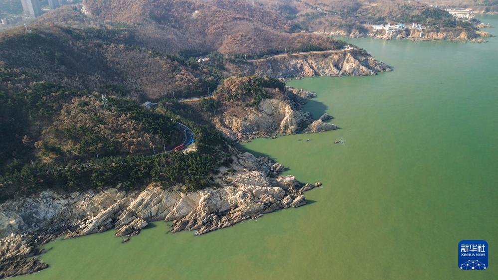 12月9日,车辆在威海市沿海岸线的自驾旅游公路上行驶(无人机照片)。
