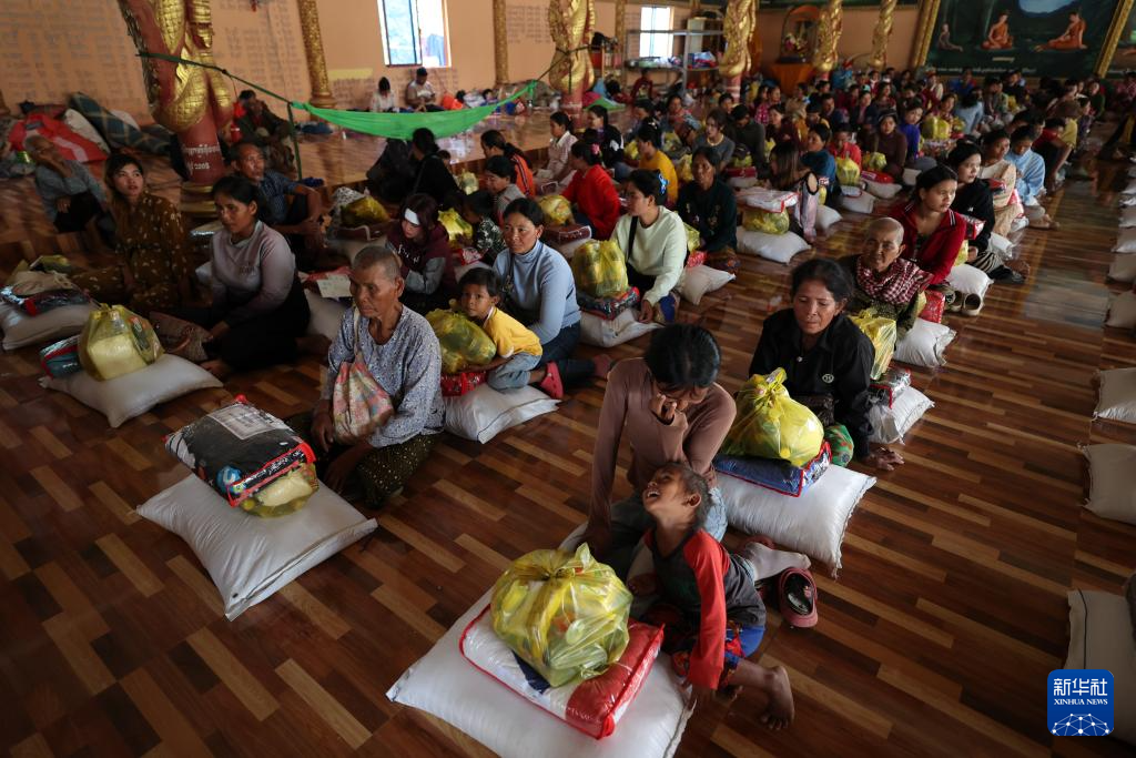 12月11日,在柬埔寨暹粒省一处居民安置点,人们领取救济物资。