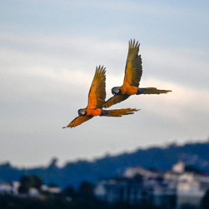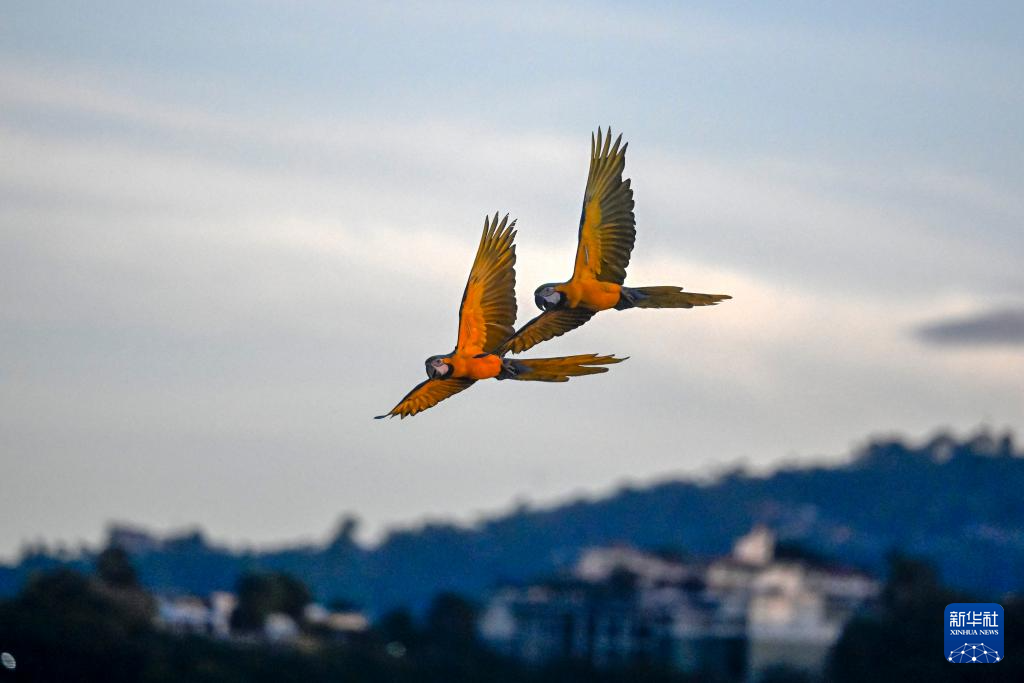 12月7日,两只金刚鹦鹉在委内瑞拉首都加拉加斯上空飞翔。