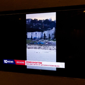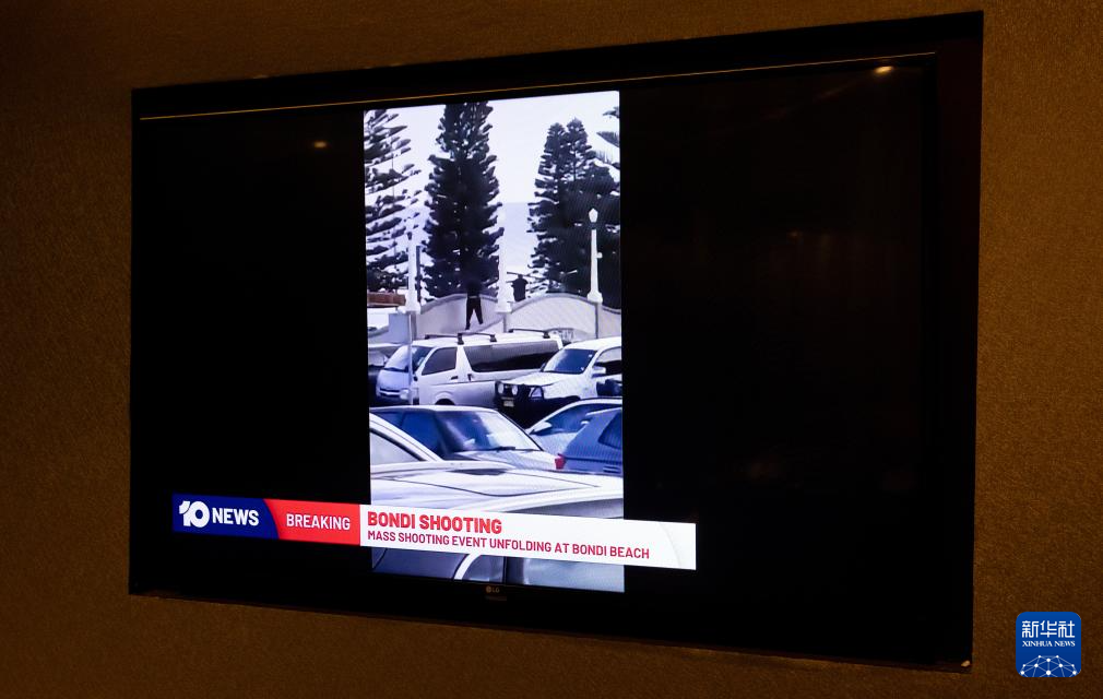 这是12月14日在澳大利亚悉尼拍摄的报道邦迪滩枪击事件的电视画面。
