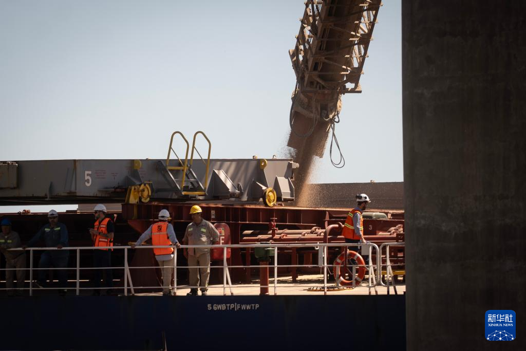 12月13日,在阿根廷圣菲省廷布埃斯港,工作人员在一艘装载阿根廷小麦的货轮旁工作。