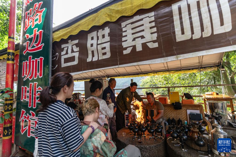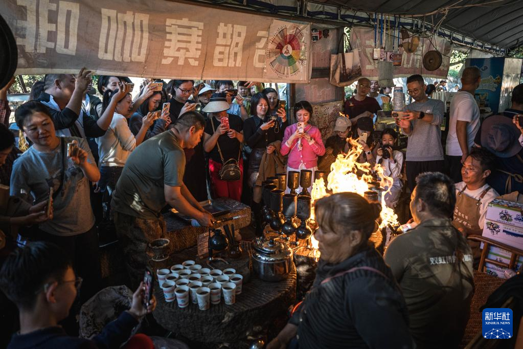 11月15日,顾客在位于云南省保山市隆阳区芒宽乡的“路边咖啡馆”拍摄“火烧咖啡”制作过程。