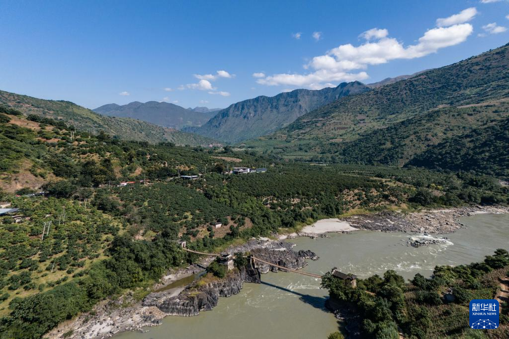 这是11月15日在云南省保山市隆阳区芒宽乡拍摄的横跨怒江的双虹桥,李金合经营的“路边咖啡馆”位于双虹桥边(无人机照片)。