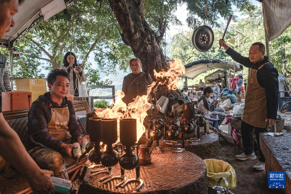 11月15日,在云南省保山市隆阳区芒宽乡的“路边咖啡馆”,店员(右)敲锣配合咖啡师制作“火烧咖啡”。
