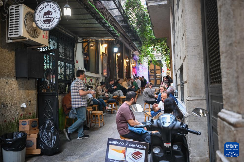 11月22日,顾客们在土耳其伊斯坦布尔的曼达巴特马兹咖啡店外的巷道里喝咖啡。