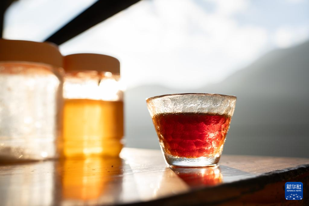 这是11月16日在云南省保山市隆阳区芒宽乡“路边咖啡馆”拍摄的李金合制作的蜂蜜和咖啡。