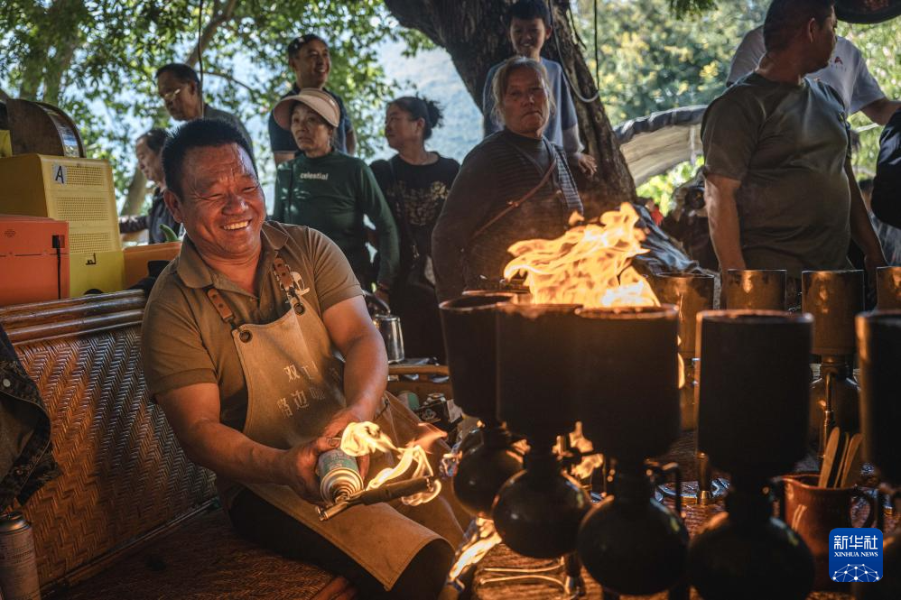 喷枪的火舌增温,虹吸壶内的咖啡粉随沸水翻动。峡谷里独特的咖啡萃取方式和怒江水一同携着咖香,流向远方。随着“火烧咖啡”走红网络,咖叔也有了知名度。