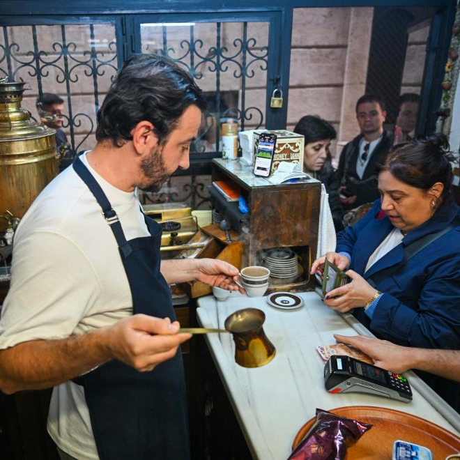 11月22日,在土耳其伊斯坦布尔的曼达巴特马兹咖啡店,一名工作人员将做好的咖啡送至顾客处。