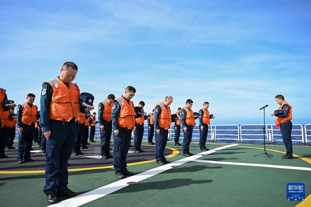 近日,在黄岩岛附近海域执行常态化巡航任务的中国海警黄岩舰执法员举行纪念仪式,为南京大屠杀死难者脱帽默哀。默哀毕,执法员们重温誓词,坚决维护我国海洋权益、捍卫领土主权完整。