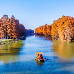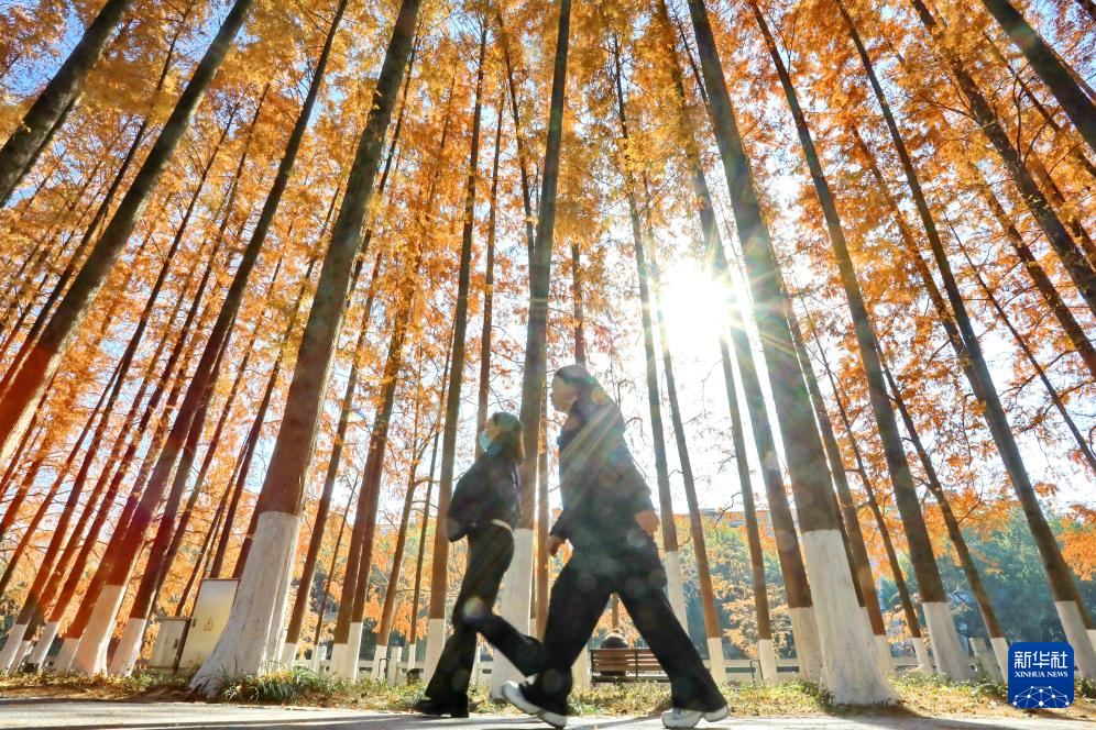12月15日,游客在浙江省嘉兴市南湖区范蠡湖公园水杉林游玩。
