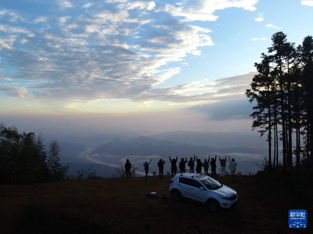 12月14日,在福建省南平市顺昌县高阳乡大富村的龙山观景台,游客自驾观看日出云海(无人机照片)。