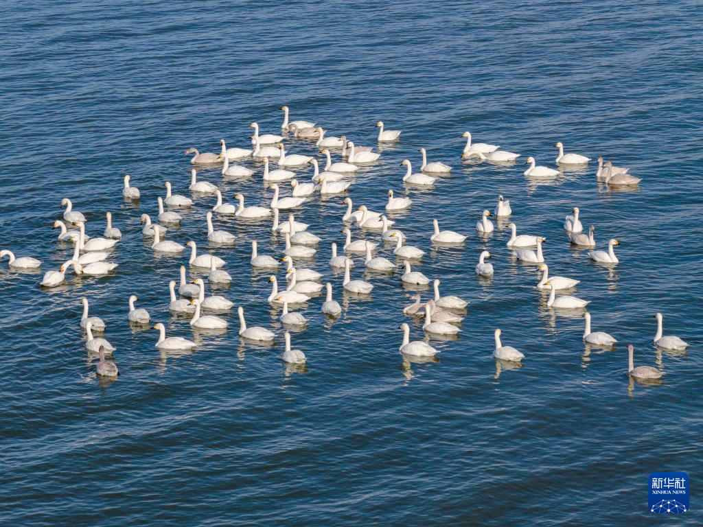天鹅在山西省长治市漳泽湖国家城市湿地公园游弋(12月2日摄,无人机照片)。