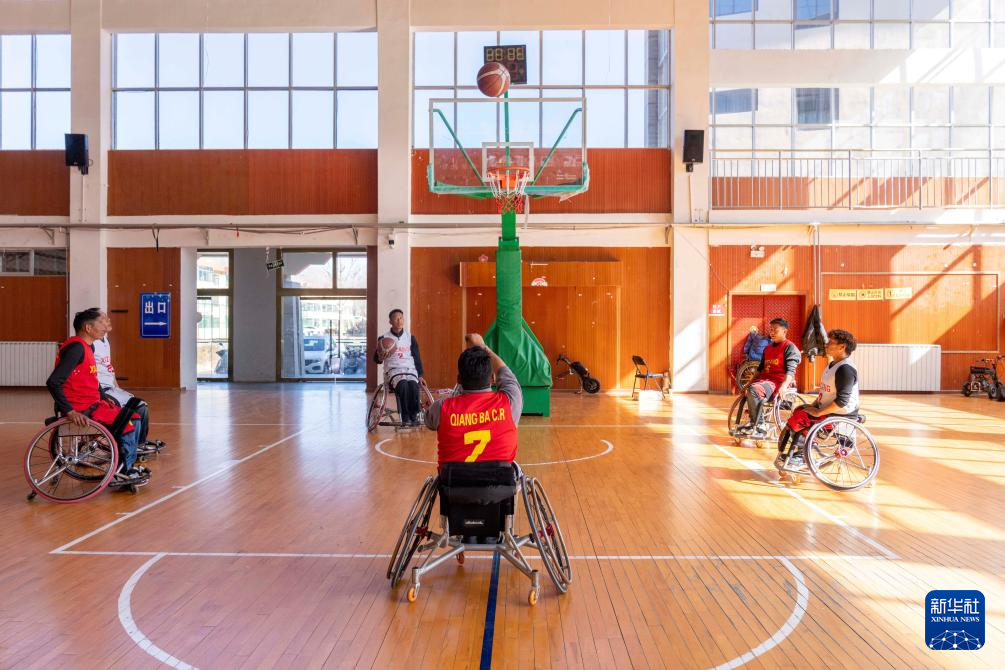 11月30日,西藏轮椅篮球队球员强巴次仁(中)在拉萨的训练场投篮。