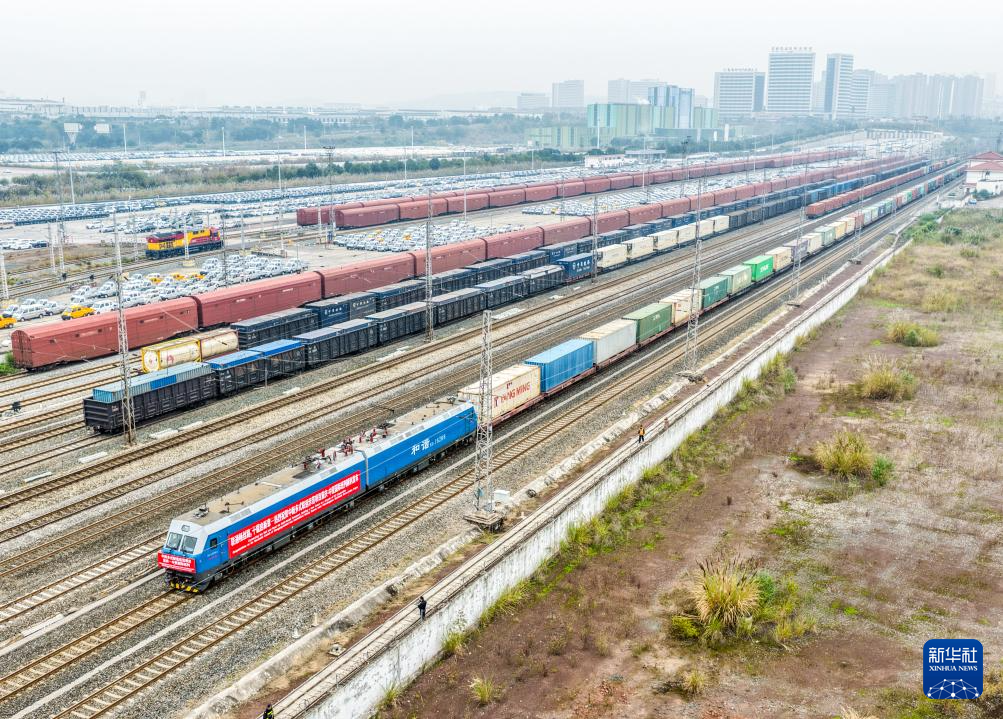 12月15日,中新多式联运示范项目重庆—东南亚班列在重庆鱼嘴站顺利发车(无人机照片)。
