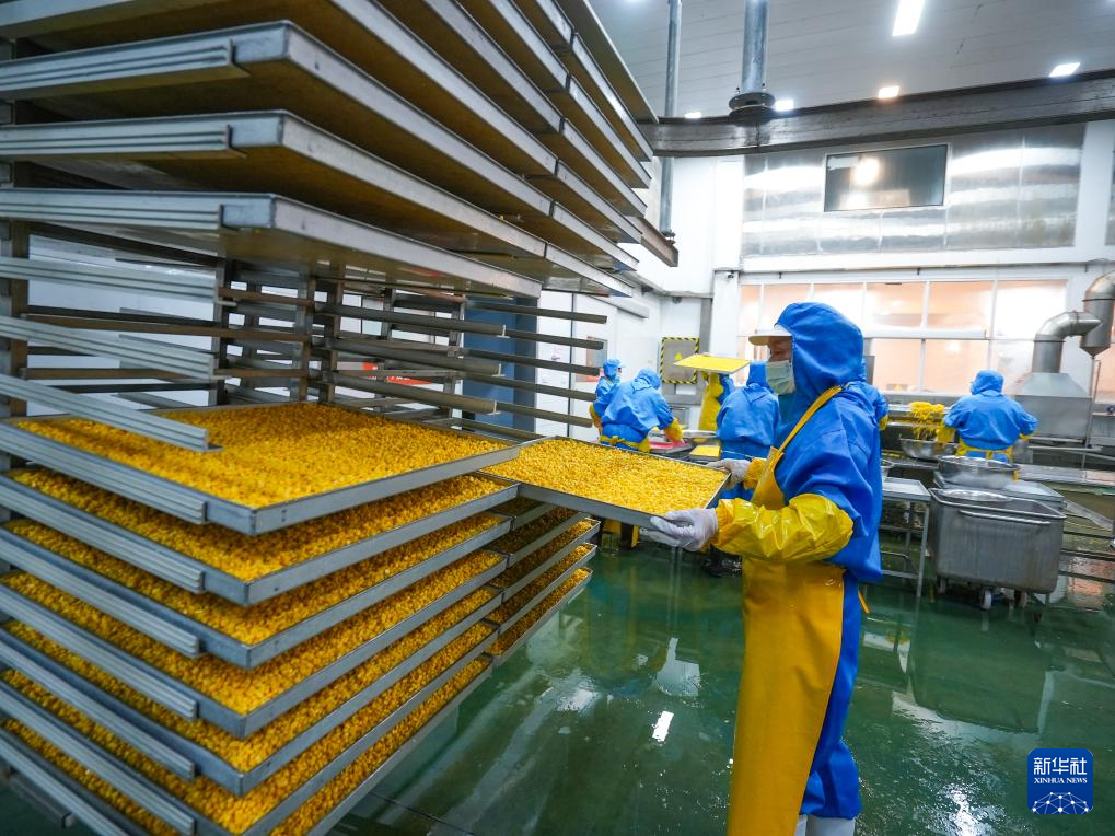 12月16日,工人在江苏省兴化市垛田街道顶能科技有限公司生产车间加工冻干玉米。