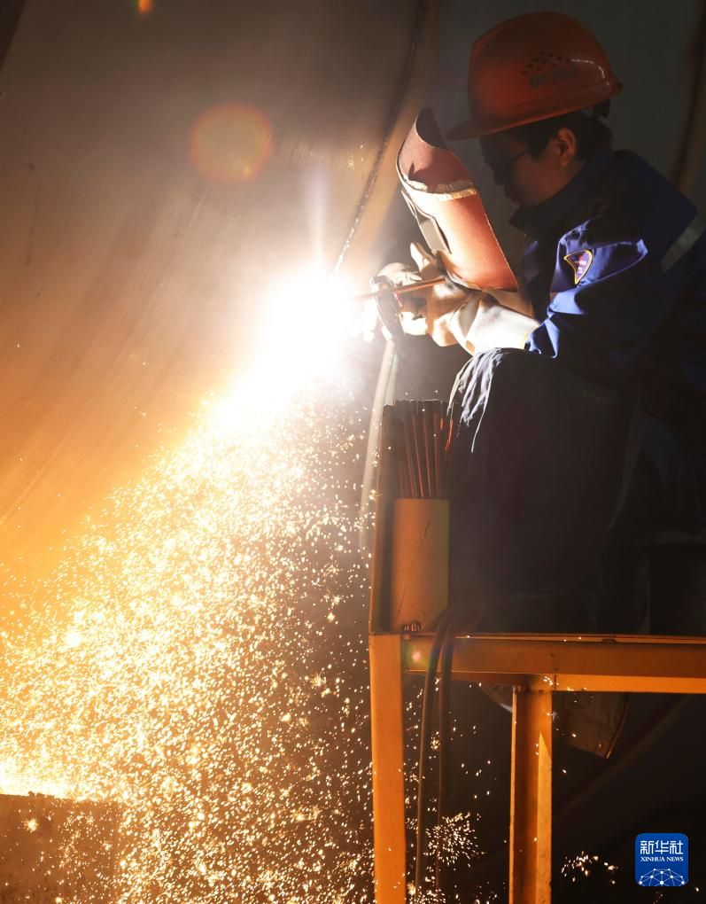 12月16日,在山东省青州市弥河镇一家水处理设备制造企业,工人在进行焊接作业。