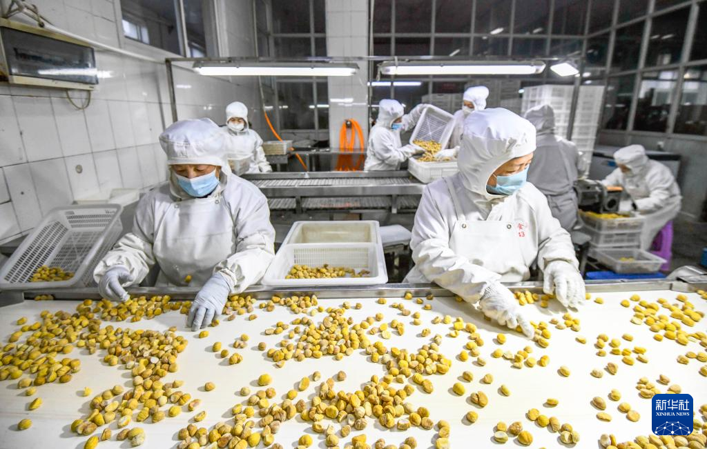 12月16日,工人在河北省遵化市苏家洼镇的一家食品有限公司车间加工板栗。