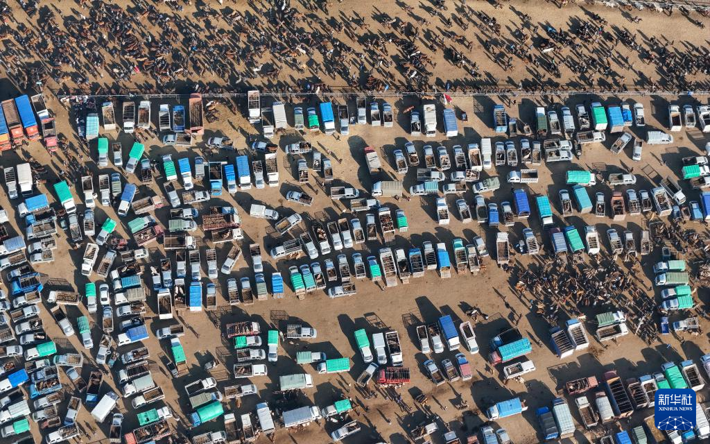 这是12月3日拍摄的新疆创锦黄公农产品交易市场的牛交易区(无人机照片)。