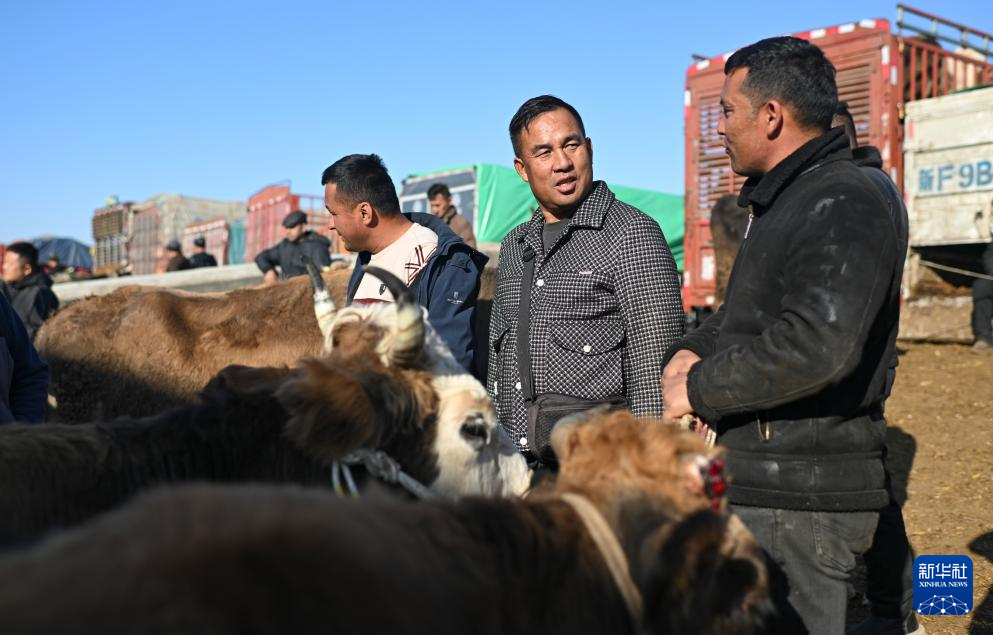 在新疆创锦黄公农产品交易市场,马军(右二)和售牛村民交流(12月1日摄)。