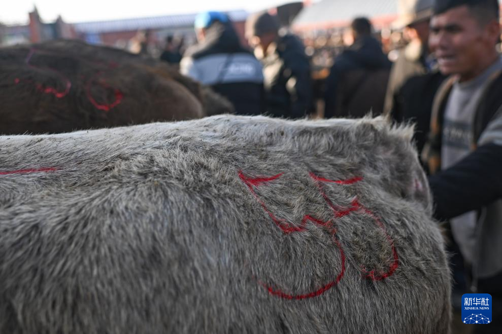 价格达成一致后,马军在选中的牛身上做标记,便于完成收购后装车转运(12月3日摄)。