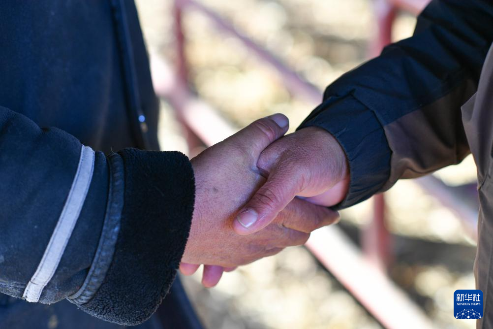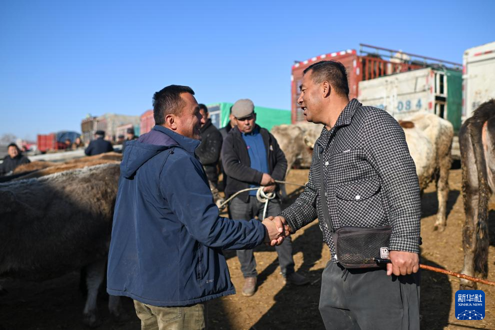 在新疆创锦黄公农产品交易市场,交易达成后,马军(右)与售牛的村民握手致意(12月1日摄)。在巴扎上,买卖双方习惯多次拍手议价,直至满意后握手成交。
