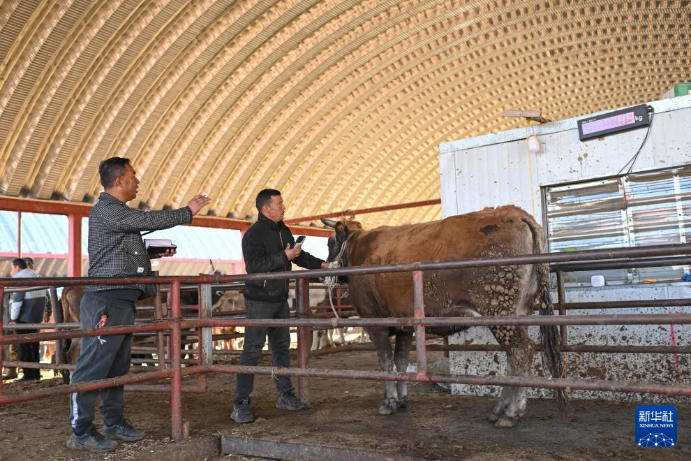 马军(中)带着来自青海的客户(左)在新疆创锦黄公农产品交易市场上选购牛(12月1日摄)。