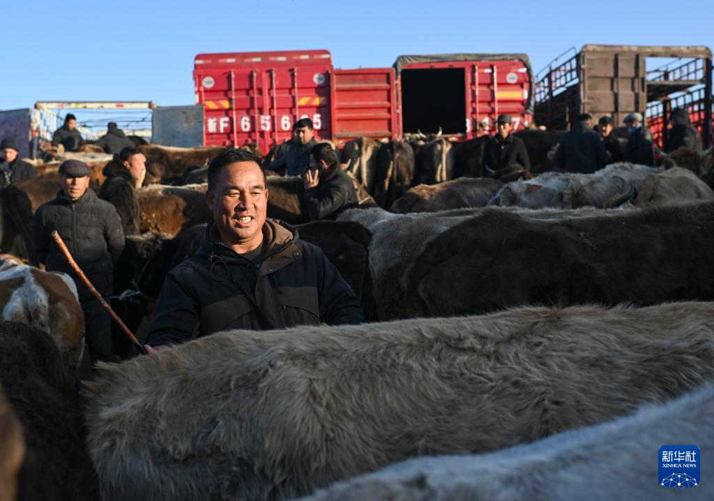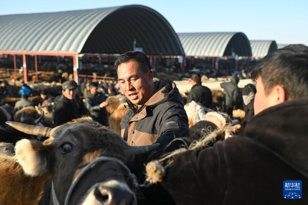 马军在新疆创锦黄公农产品交易市场为客户挑选牛(12月3日摄)。