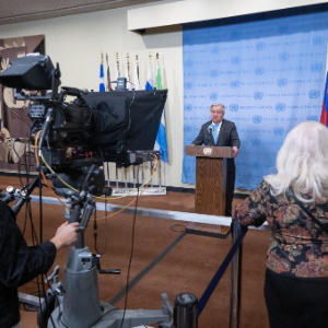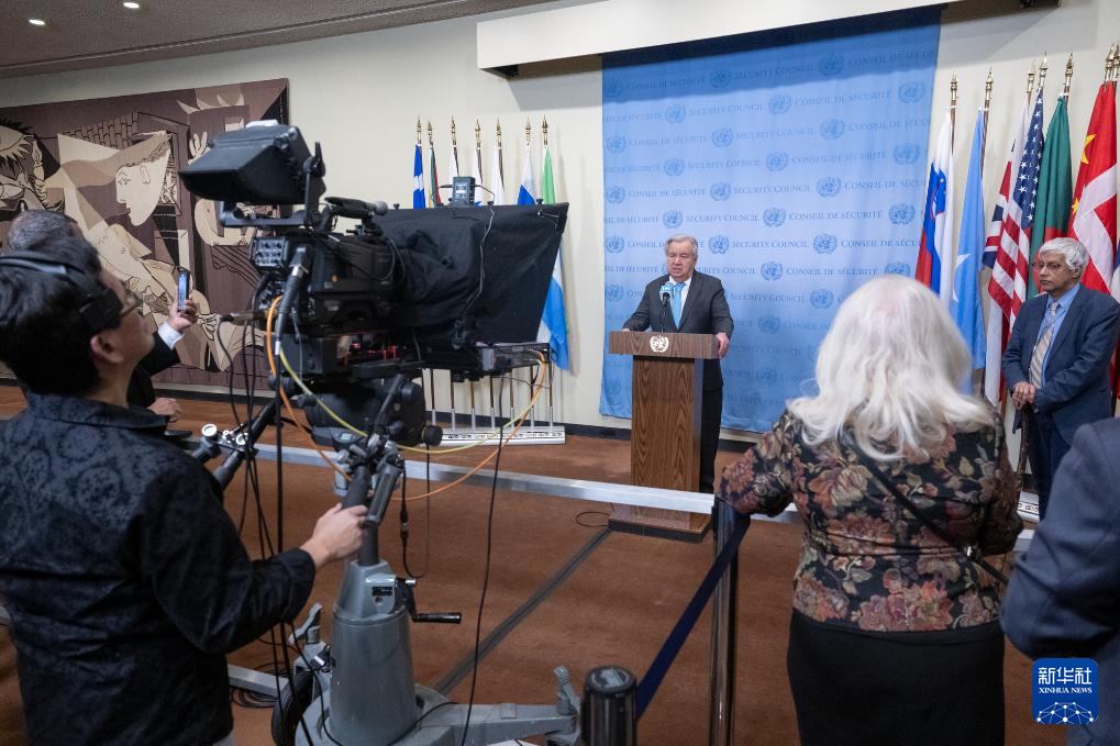12月17日,在位于纽约的联合国总部,联合国秘书长古特雷斯(中)在记者见面会上讲话。
