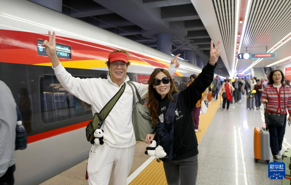 12月22日,搭乘从广州白云站开往湛江北站首发列车的旅客在广州白云站留影。