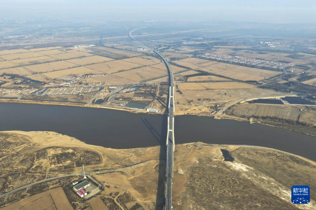 12月22日拍摄的包银高铁乌海黄河特大桥(无人机照片)。