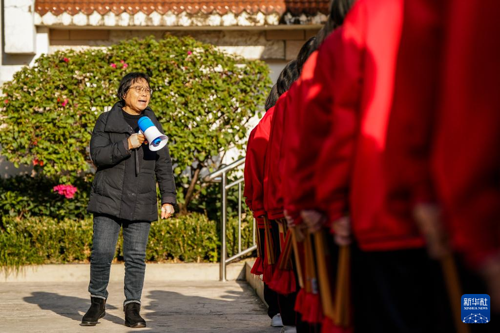 12月13日,张桂梅在华坪女高组织学生们做早操。