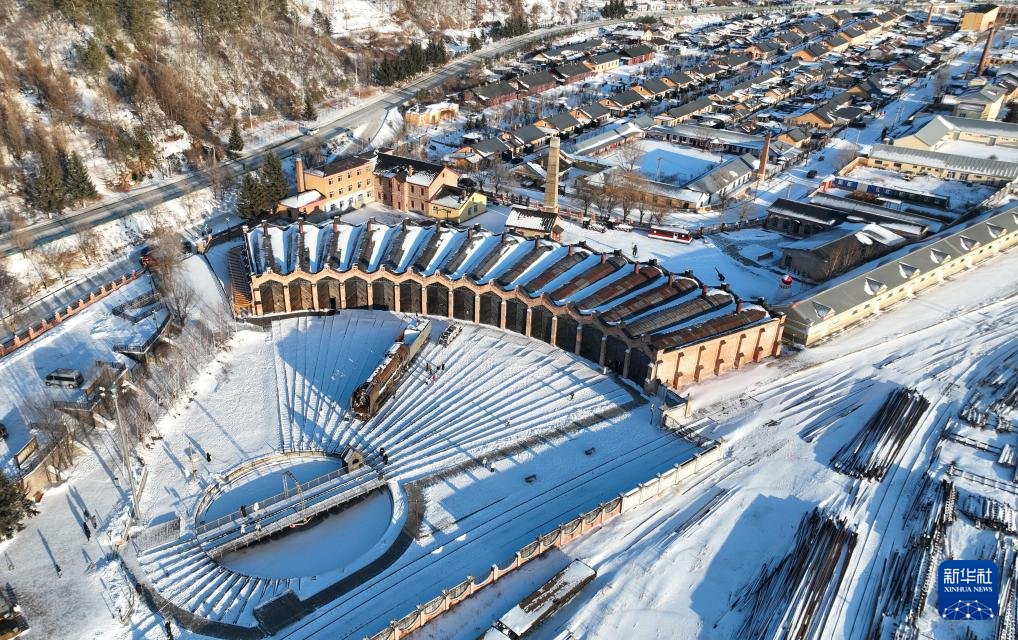 12月24日,游客参观横道河子镇中东铁路博物馆机车库展区(无人机照片)。