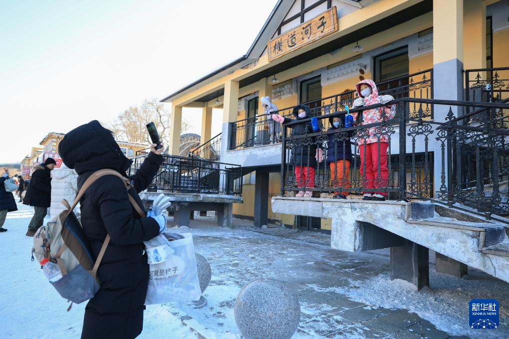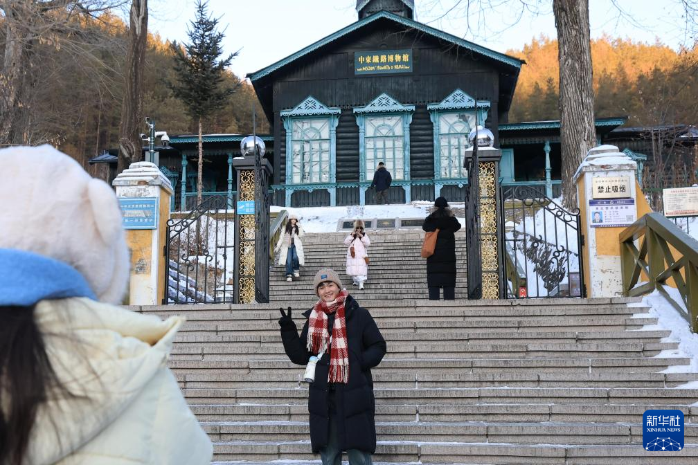 12月24日,游客在横道河子镇中东铁路博物馆前拍照。