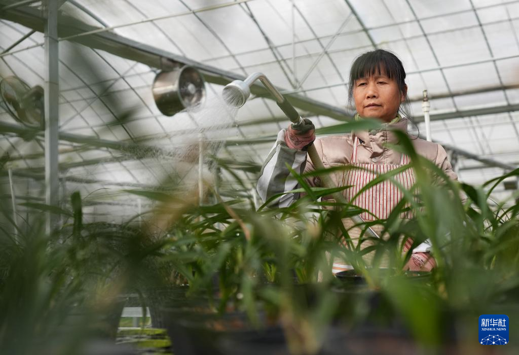 12月25日,“竹乡兰苑”的工作人员给兰花浇水。