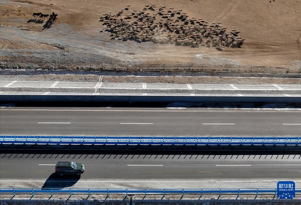 车辆行驶在新疆和静县境内的乌尉高速公路上(12月23日摄,无人机照片)。