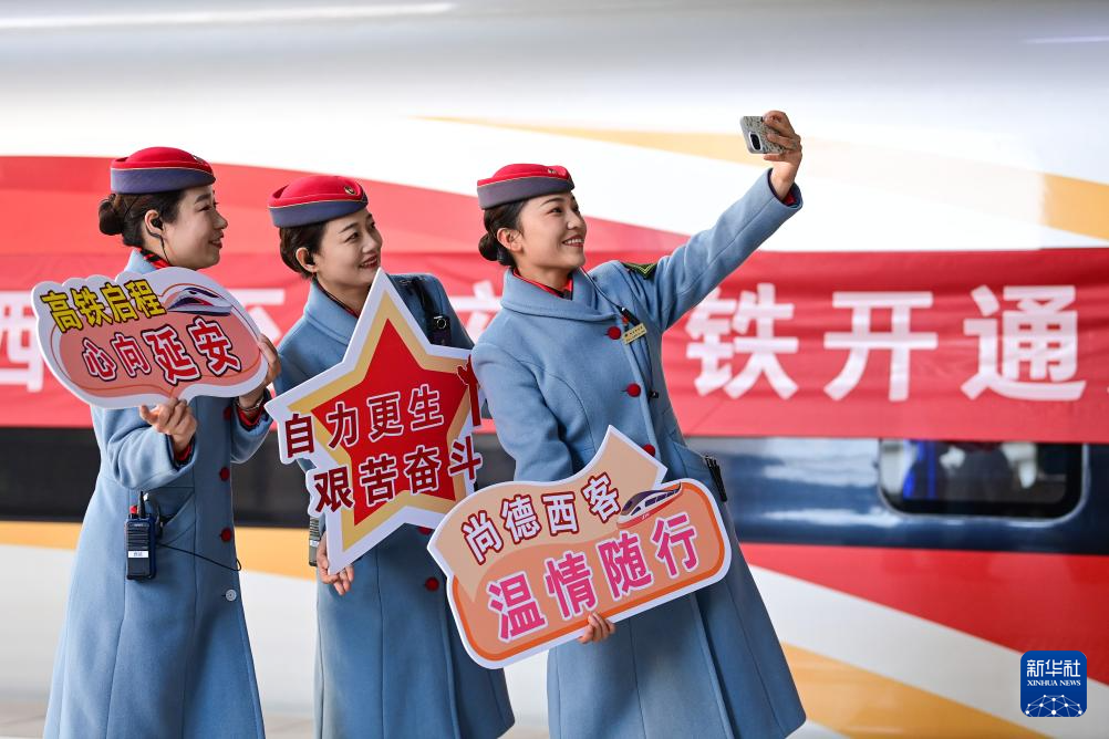 12月26日,乘客和乘务人员在西安开往延安的西延高铁C9312次首发列车前拍照留念。
