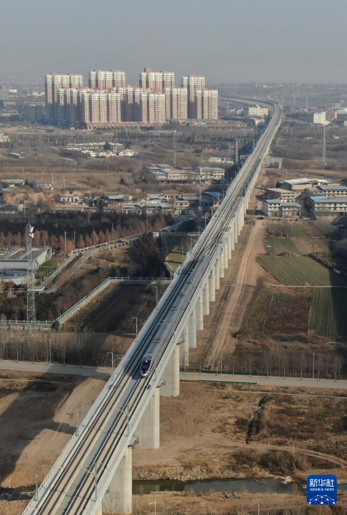 12月26日,延安开往西安的西延高铁首发C9309次列车即将驶入富平南站(无人机照片)。