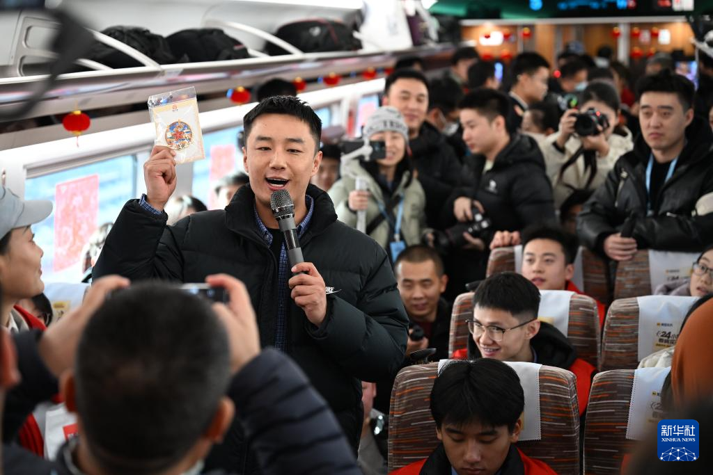 12月26日,工作人员在西安北至延安C9312次列车上与乘客互动答题。