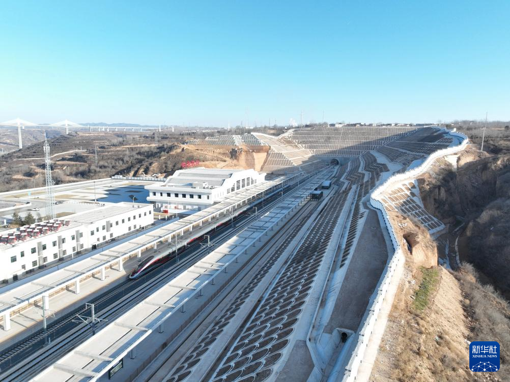 12月26日,西安开往延安的西延高铁列车驶过铜川北站(无人机照片)。
