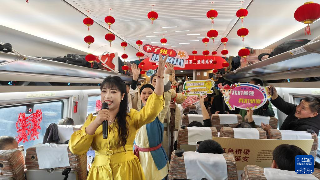 12月26日,演员在延安开往西安的首发列车上表演节目。
