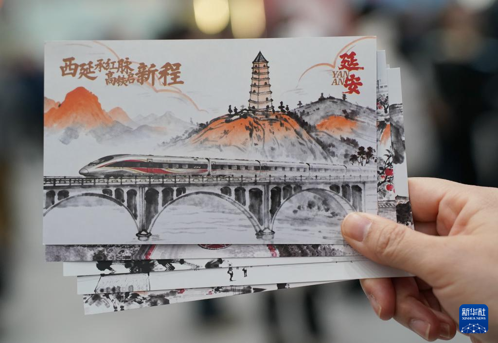 12月26日,乘客在西安北站展示西延高铁开通主题明信片。